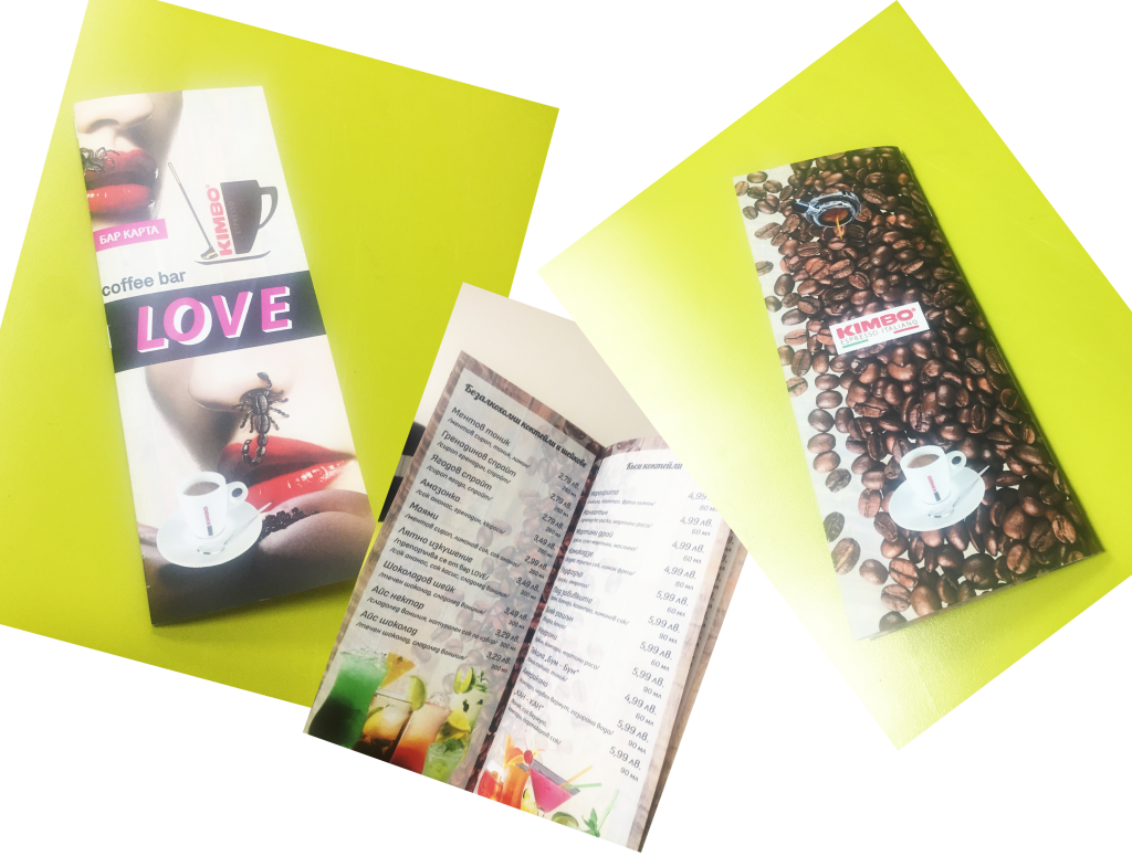 Дизайн, предпечат и печат на менюта за барове, ресторанти, заведения за бързо хранене и др. Отпечатване на различни медии, ламиниране