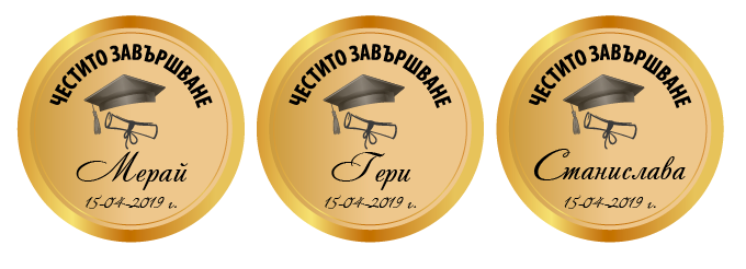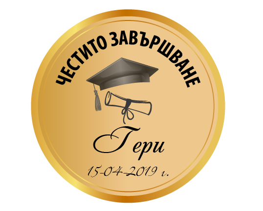 Кръгъл етикет за бутилка за абитуриентски бал „Честито завършване/дипломиране“ с диаметър 7 см