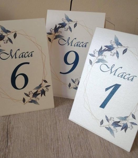 Картичка с номер на маса „Blue“, отпечатана върху перлен картон 250 g с размери 10х15 см в прегънато състояние – налични от маса 1 до маса 16